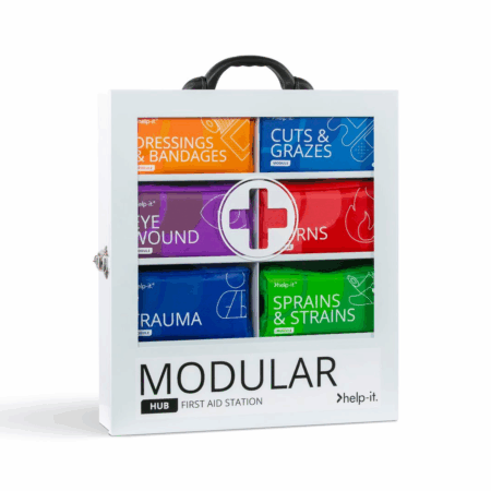 Help-It Modular Hub First Aid Station The Help-It Modular Hub First Aid Station features six color-coded, injury-specific modules securely housed in a durable wall-mounted cabinet with a clear Perspex front. This design keeps first aid essentials highly visible, accessible, and protected, ensuring rapid response in emergencies.
